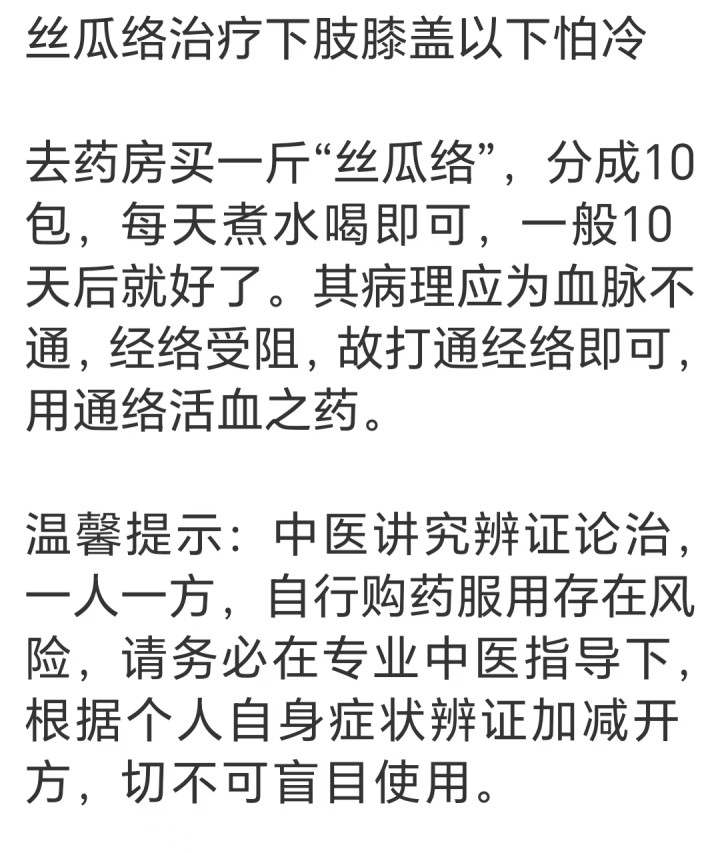 重要提醒:中医讲究辨证论治,这份方法是针对经络淤堵、气血不畅的情况总结的经验,并非人人适用的万能药。每个人的体质不同,身体的状态也各有差异,切不可凭着热忱随意尝试,自行购药服用存在风险。它更像一份藏在丝瓜络里的提醒,告诉我们身体的每一份冰凉,都需要带着敬畏与谨慎,在专业医师的指导下慢慢调理,让这份朴素的生活智慧,真正成为守护健康的屏障。